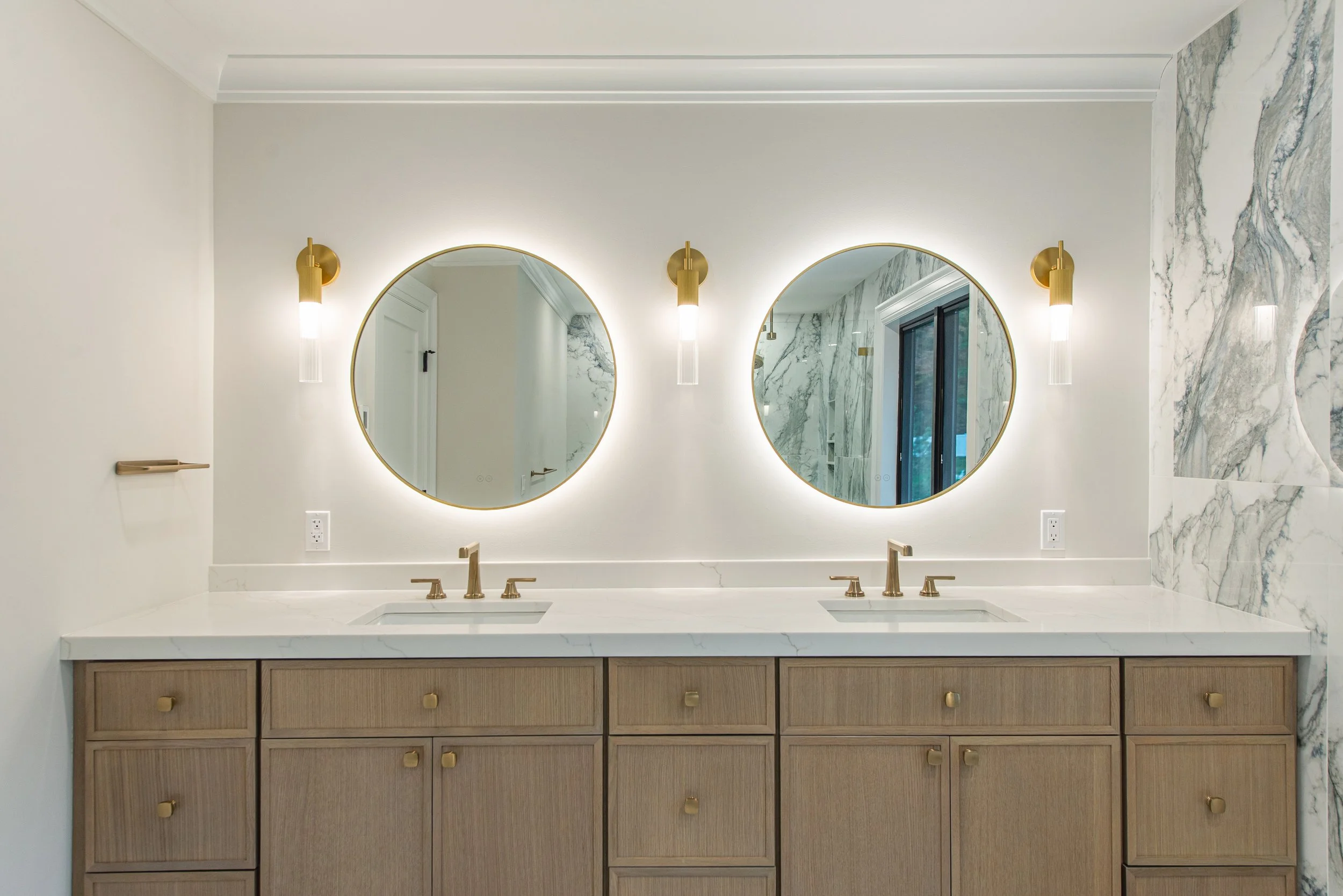 Double vanity with 2” quartz counters, LED wall sconces, and mirrors