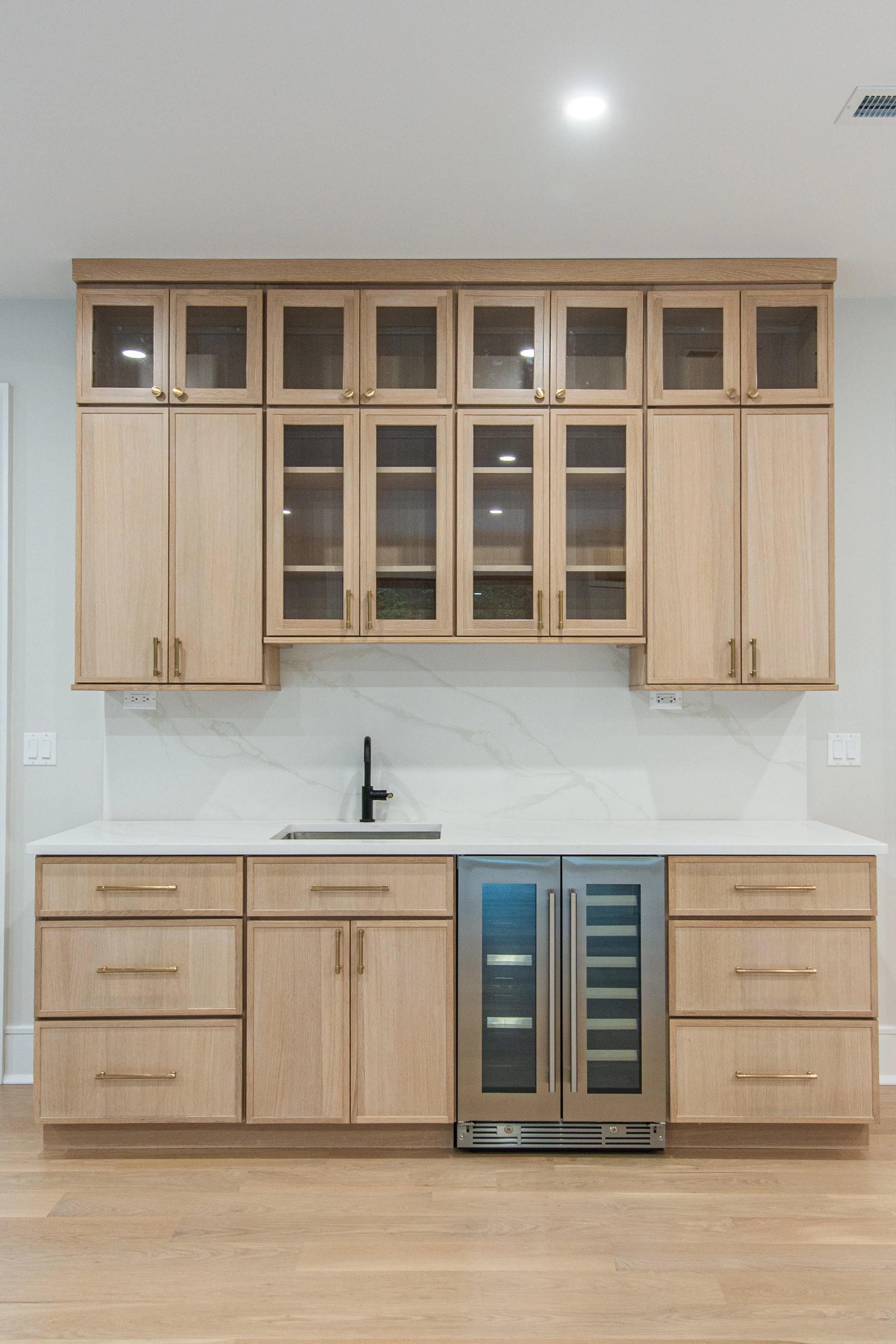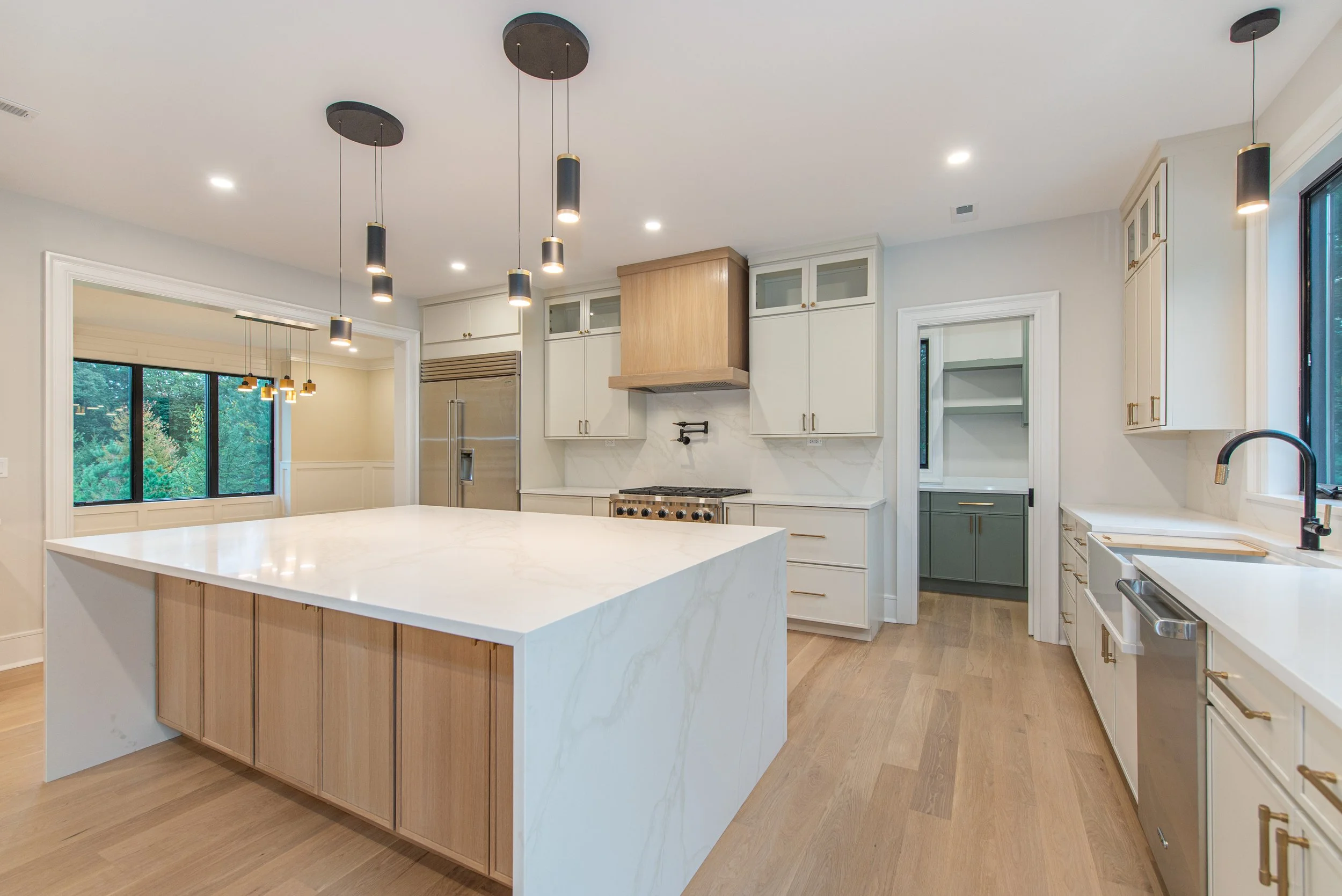 Designer kitchen with custom-made white oak and white cabinetry (U.S.-made, slim shaker doors)