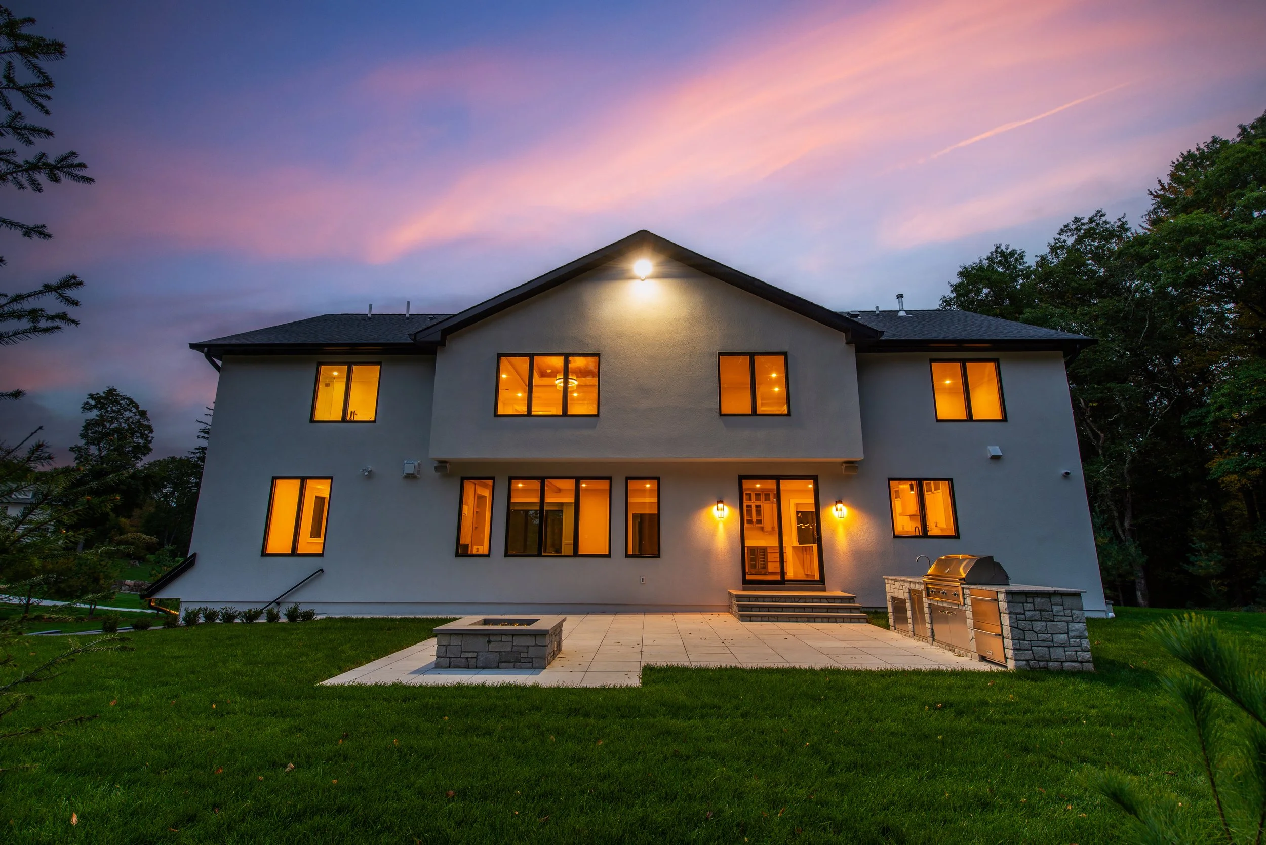 Exterior lighting by Kichler with flood lights and soffit accent lights