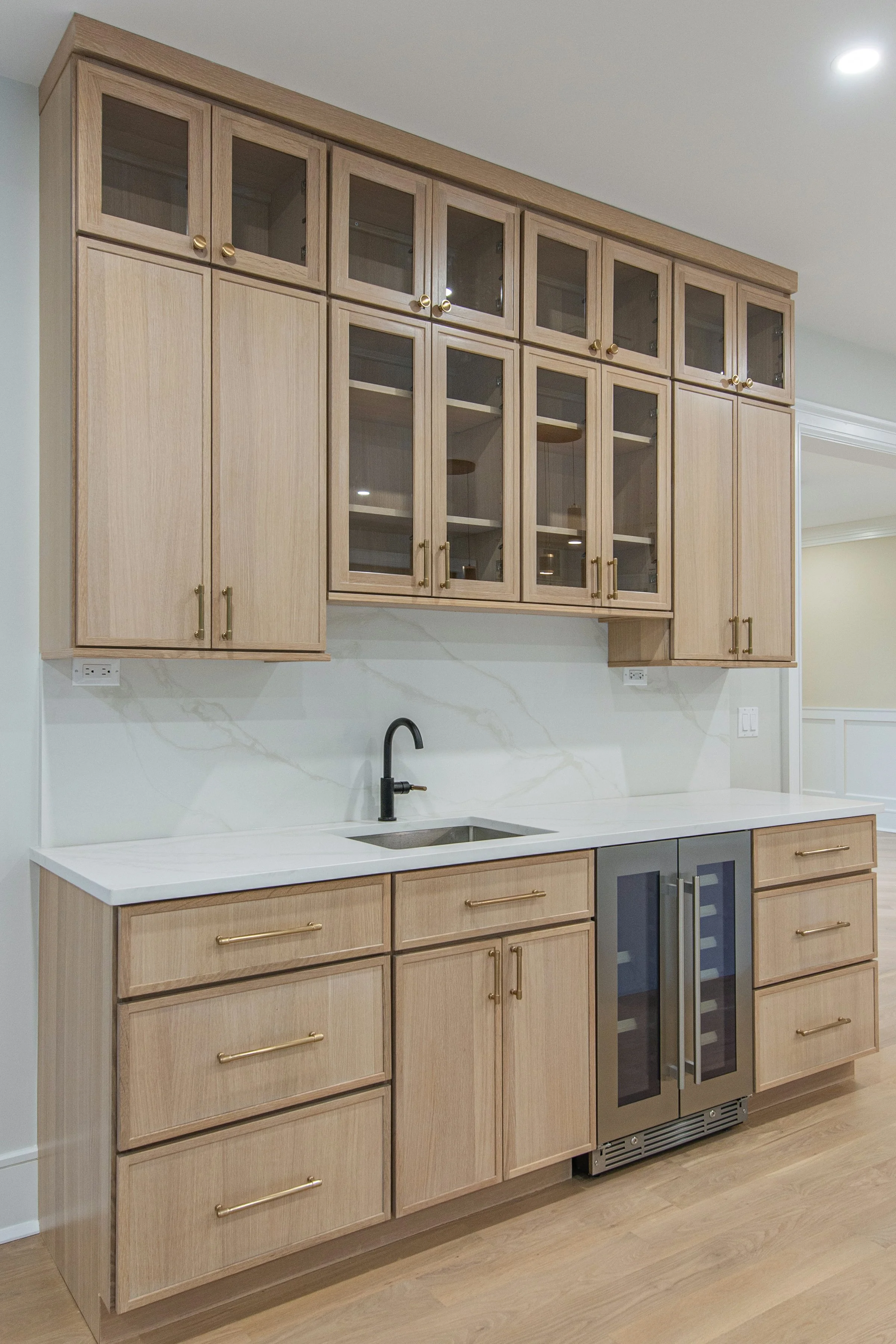 Separate bar area with sink, Brizo faucet and beverage refrigerator
